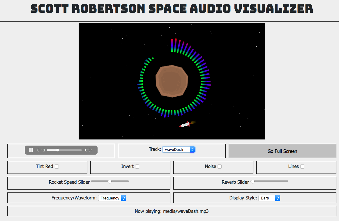 This is a Audio Visualizer with controls that effect the sound and the visualization. It was made in JavaScript as a web app, and uses the HTML5 canvas element for the display.