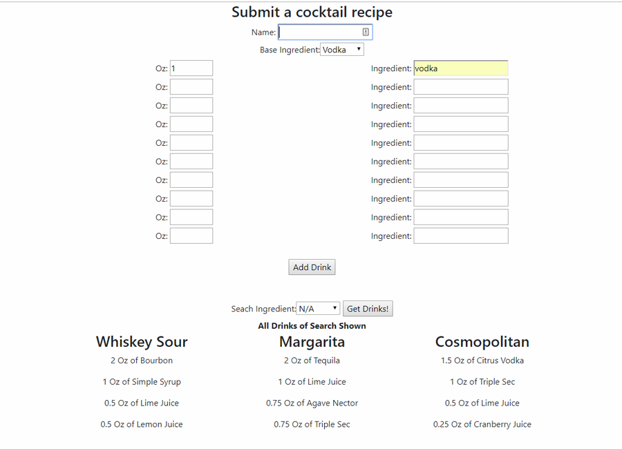This is a web app and API that users can use to upload their own drink recipies. It uses MongoDB for the database and the API handles user login and recipe adding. The users can also search for recipes by their main ingredient/spirit.