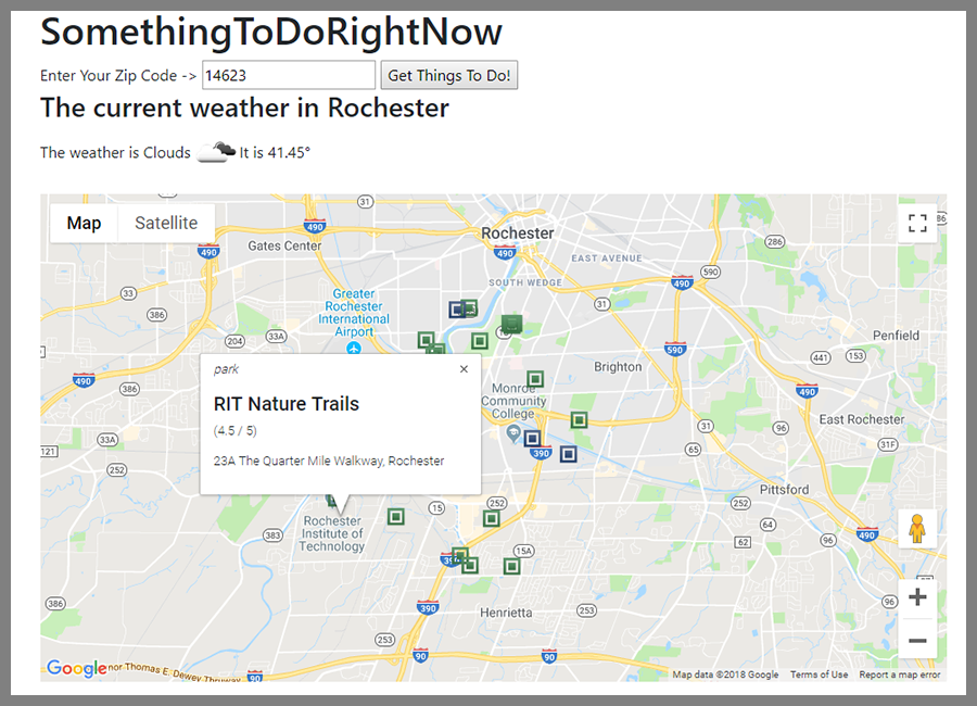 SomethingToDoRightNow is a web app implmenting a weather api and the Google Maps api. The app takes the user's inputed zip code and gives them a map with pins making places that are something to do right noe. It fetches places that are both open, and weather appropriate.